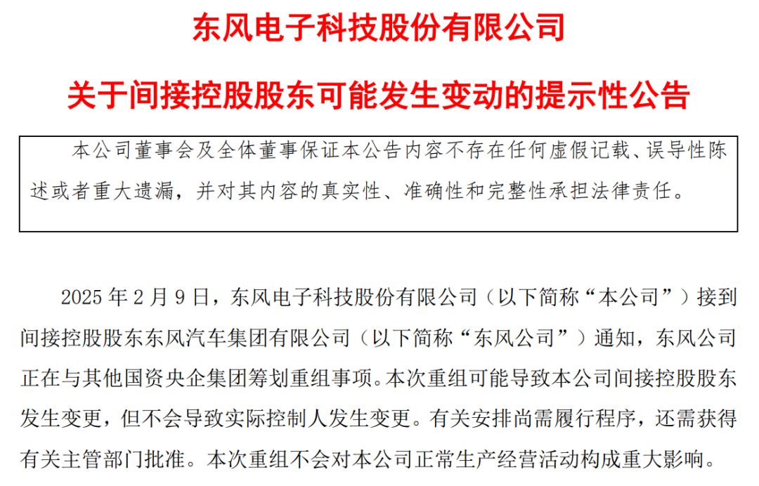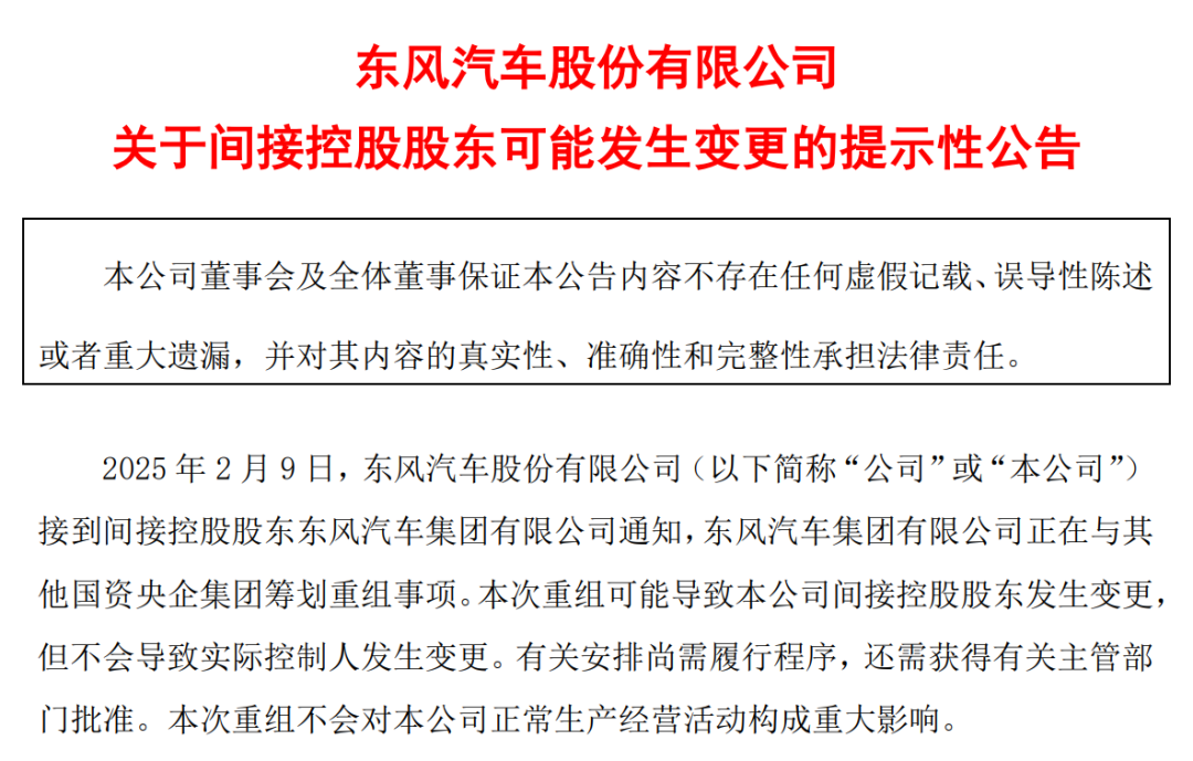 2月9日晚间,东风集团股份、东风股份、东风科技等三家东风汽车集团旗下上市公司公告,2025年2月9日,接到控股股东东风汽车集团通知,东风汽车集团正在与其他国资央企集团筹划重组事项。