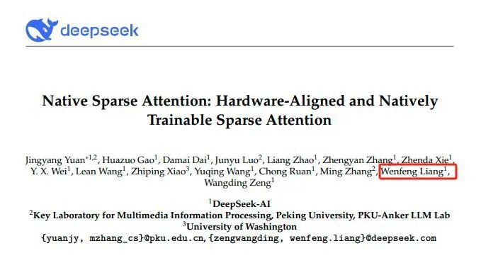 在这篇名为《原生稀疏注意力:硬件对齐且可原生训练的稀疏注意力机制》(Native Sparse Attention: Hardware-Aligned and Natively Trainable Sparse Attention)的论文署名中,DeepSeek创始人兼CEO梁文锋也作为共创在列。