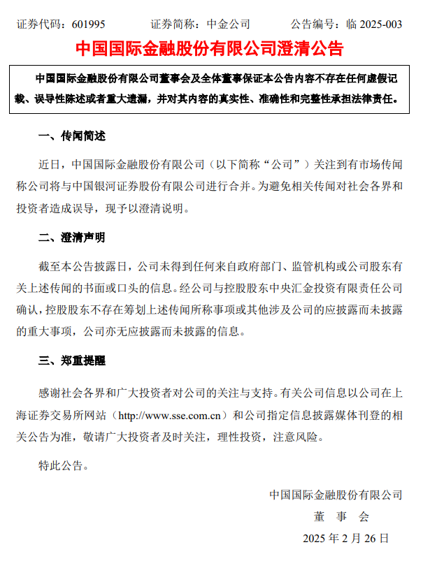 晚间,中金公司发布澄清公告称,关注到市场传闻称公司将与中国银河证券股份有限公司进行合并,现予以澄清说明。