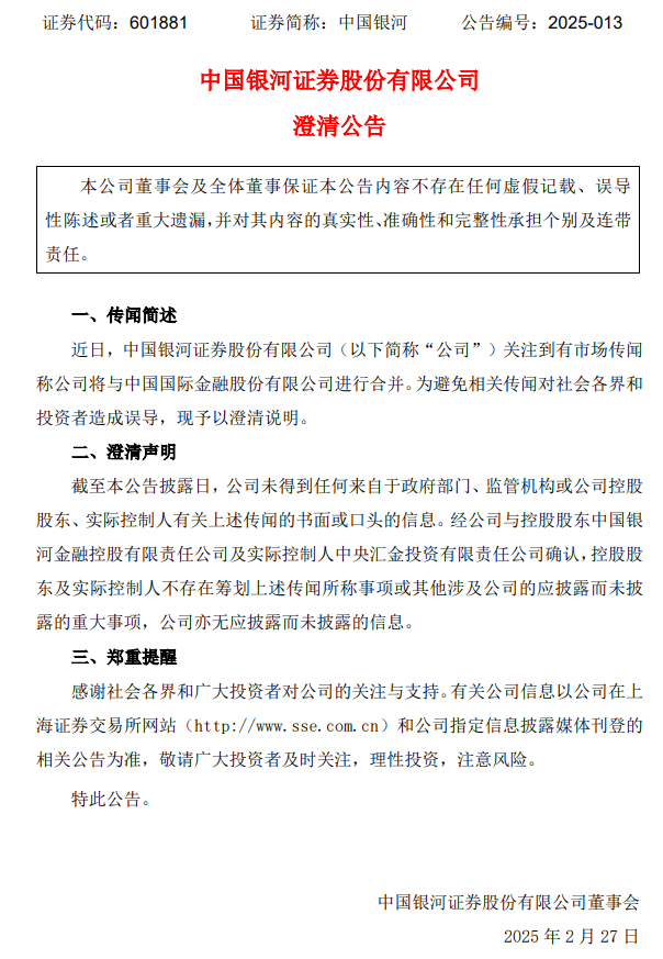 同日,中国银河也发布澄清公告称,公司关注到有市场传闻称公司将与中国国际金融股份有限公司进行合并。为避免相关传闻对社会各界和投资者造成误导,现予以澄清说明。
