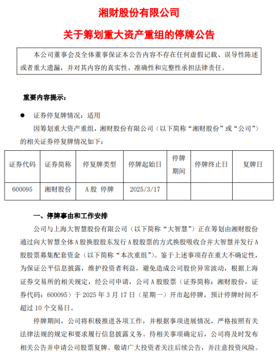 值得一提的是,尽管此次交易并非双方首次尝试深度融合,并购重组具备的不确定性需要重视。湘财股份也提到,停牌期间,公司将积极推进各项工作,并根据事项进展情况,严格按照有关法律法规的规定和要求履行信息披露义务。待相关事项确定后,公司将及时发布相关公告并申请公司股票复牌。敬请广大投资者关注后续公告,并注意投资风险。