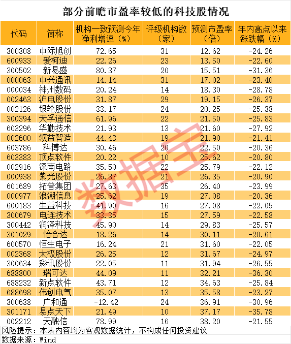部分优质科技股或被错杀。据证券时报·数据宝统计,10家及以上机构评级的科技股中,有29股机构一致预测今年市盈率低于40倍且年内高点以来跌超20%。