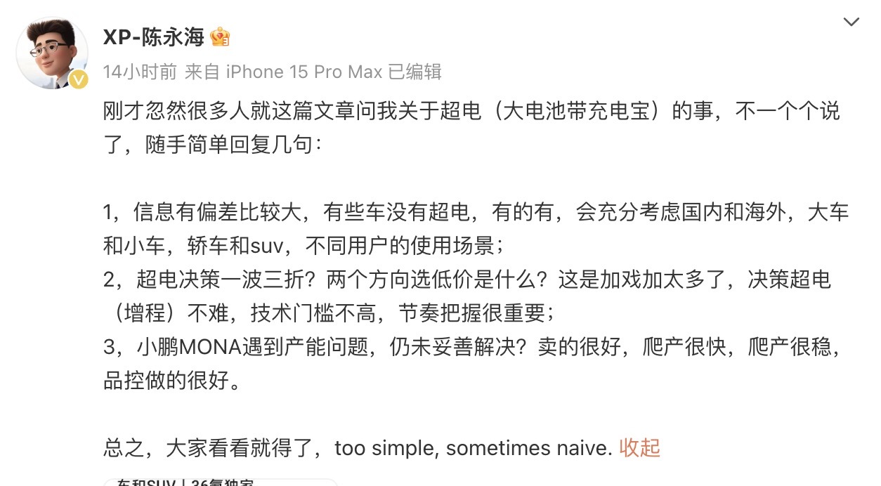 对此,小鹏汽车副总裁陈永海在社交媒体上表示:“(报道)信息有偏差(且)比较大。有些车没有超电(增程),有的有。(是否使用超电)会充分考虑国内和海外,大车和小车,轿车和SUV,不同用户的使用场景(等因素)。”