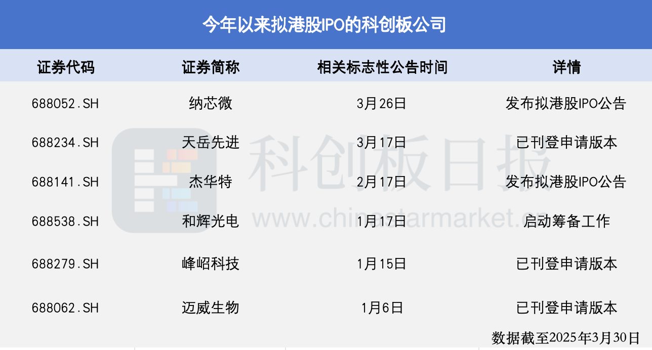 财联社星矿数据统计显示,今年以来截至3月30日,已有超30家A股企业披露拟港股IPO,其中包括纳芯微、天岳先进、杰华特等六家科创板公司。