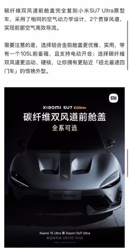 小米对SU7 Ultra对碳纤维双风道前舱盖的官方介绍