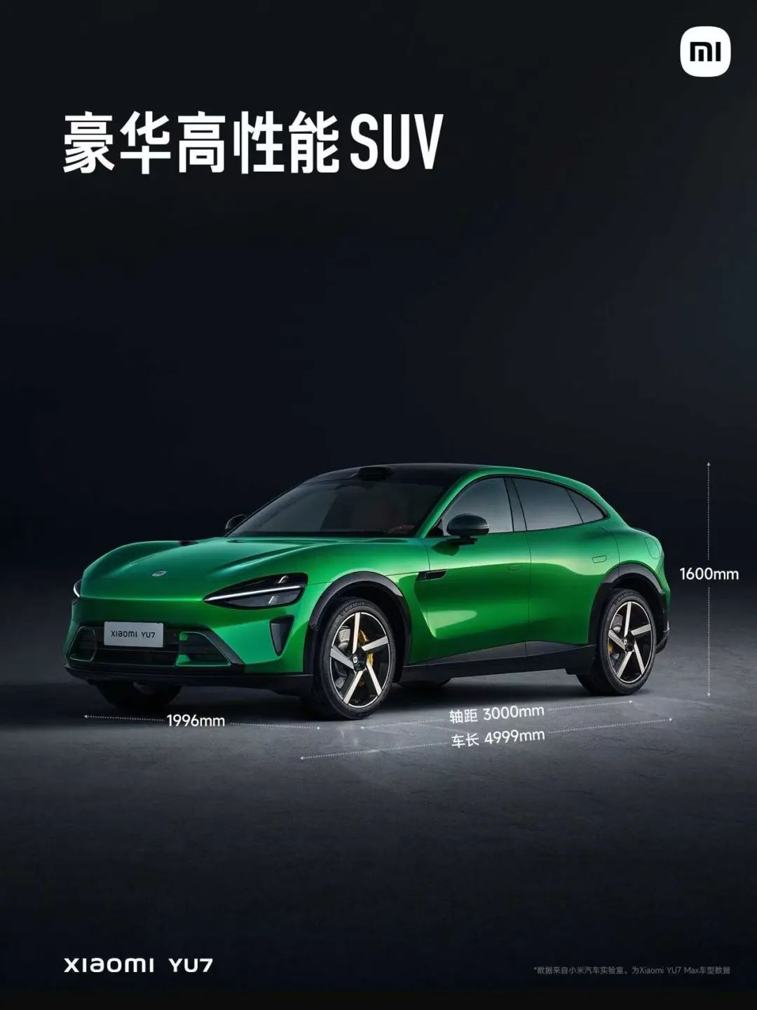 据雷军介绍,小米YU7长宽高分别为4999/1996/1608(1600)mm,轴距达到3000mm,是一款中大型SUV。