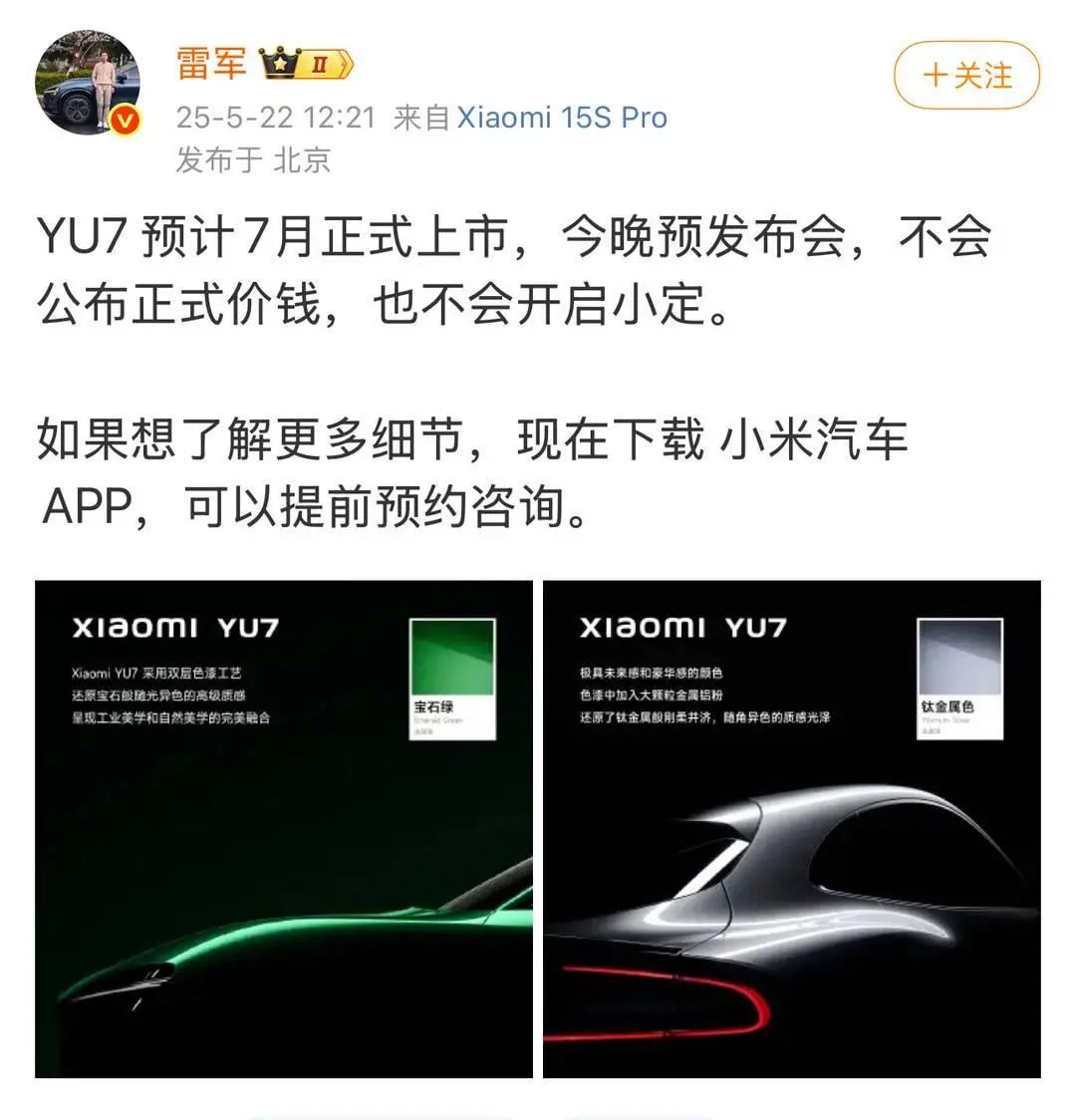 值得注意的是,5月22日中午,雷军发文称,YU7预计7月正式上市,今晚(22日)预发布会,不会公布正式价钱,也不会开启小定。