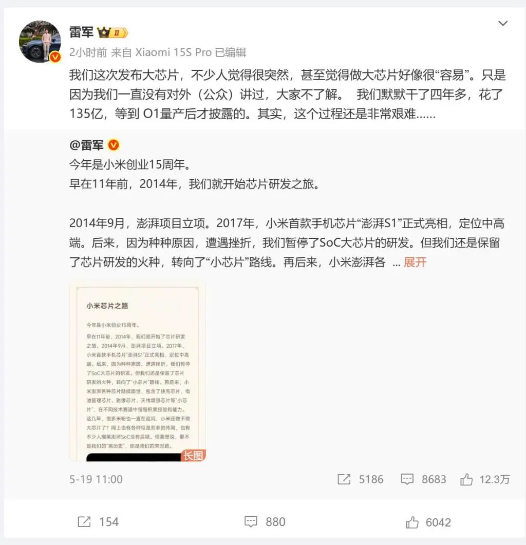 此前,雷军发布微博透露,研发玄戒O1芯片的过程“还是非常艰难”。四年多时间,截至今年4月底,玄戒累计研发投入已超过135亿人民币。目前,研发团队已超过2500人,今年预计研发投入将超过60亿元。