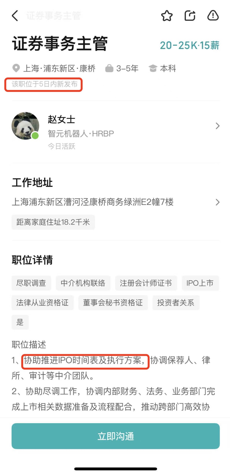 《科创板日报》记者注意到,智元机器人正式开始招聘证券事务主管,招聘软件显示该职位为5日内新发布,岗位职责为协助推进IPO时间表及执行方案,跟进上市申请文件编制与审核和监管问询与回复,负责公司上市后的信息披露合规工作等。