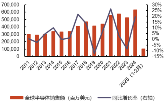 受益于新一轮智能终端产品的功能升级和性能提升,对智能手机、个人电脑、穿戴类设备等消费电子产品的需求已呈现增长态势,全球半导体产业整体复苏迹象显著。根据世界半导体贸易统计组织(WSTS)的数据,2024年全球半导体销售额达6276亿美元,同比增长19.1%。该机构预计,2025年全球半导体市场的增幅或将有所回落,但仍能达到11.2%。
