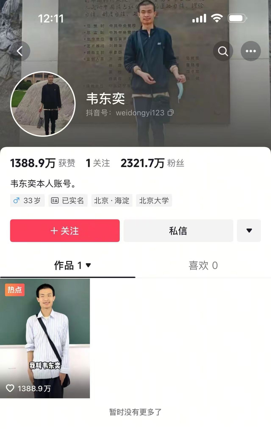 开号3天粉丝破2000万,“韦神”吸粉出圈的速度令人瞠目结舌。对于这种现象级涨粉,极目新闻发评表示,这并非偶然,甚至可以说是意料之中。韦东奕过往给人的印象,就是北大“扫地僧”,是天才与纯粹的结合体——令人惊叹的学术成就,不修边幅的外表,极度简朴、几乎与俗世隔绝的生活方式,这些特质让他在浮躁的网络时代自带与众不同的光环。