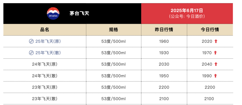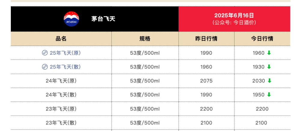 值得注意的是,茅台批发价格在6月以来也呈现波动下探趋势。据第三方平台“今日酒价”价格显示,6月16日,25年53度500ml飞天茅台原装和散装批发价格继续下探,6月16日分别为1960元和1930元,15日价格为1990元和1960元。不过6月17日茅台价格小幅回涨,25年飞天茅台原装和散装批发价格分别为2020元和1970元。