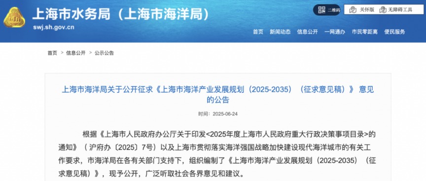 据上海市水务局官网,《上海市海洋产业发展规划(2025—2035)(征求意见稿)》(以下简称《意见稿》)公开征求意见。其中提到,建设世界级船舶与海工装备产业集群。营造世界级船舶制造业产业生态、提升高端海工装备竞争力、构建具有全球引领力的世界级船海集团;构建世界级海洋新兴产业创新生态。