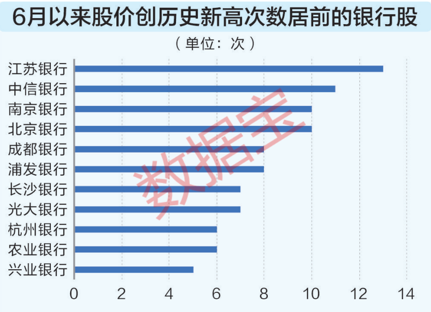 据证券时报·数据宝统计,6月以来共有19只银行股股价突破历史新高,占总数的比例达到45.24%。其中,江苏银行在17个交易日内13次创历史新高居首;其他还有中信银行、南京银行、北京银行等,分别创下11次、10次、10次历史新高。