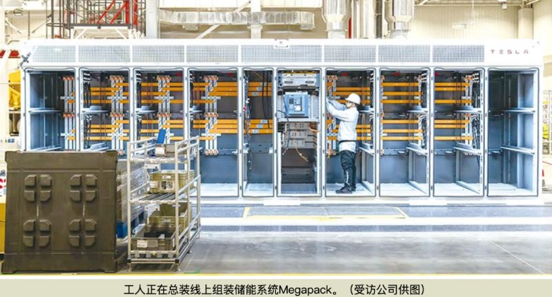走进特斯拉储能工厂总装车间,工人们正在总装线上有条不紊地组装着一台台储能系统Megapack。每台Megapack储能规模超过3.9兆瓦时(约3900度电),约可满足3600户家庭一小时用电需求。