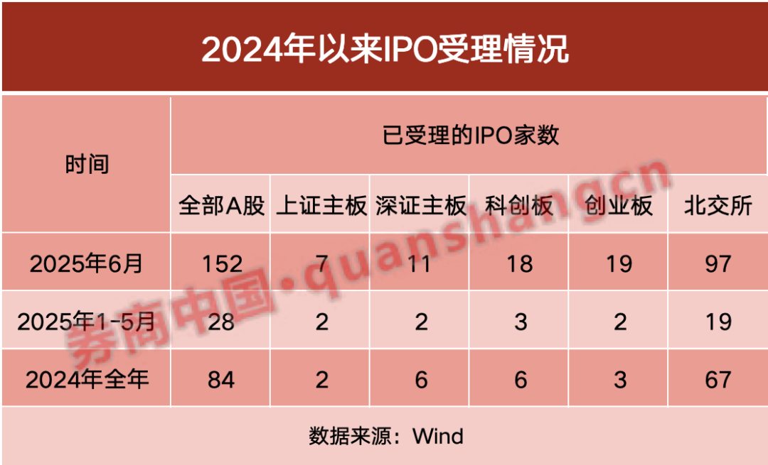 6月以来,A股IPO新增受理量大增。数据显示,6月A股新增IPO受理企业家数达到152家,超过今年前5个月及去年全年总和。
