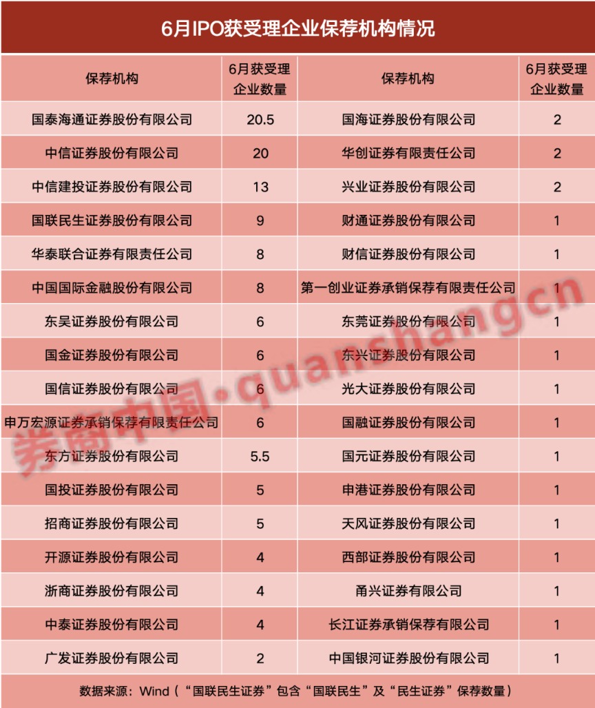 值得一提的是,上述“两超四强”6家投行,合计有78.5家保荐企业在6月份获受理,占据当月IPO受理企业总数的半壁江山。