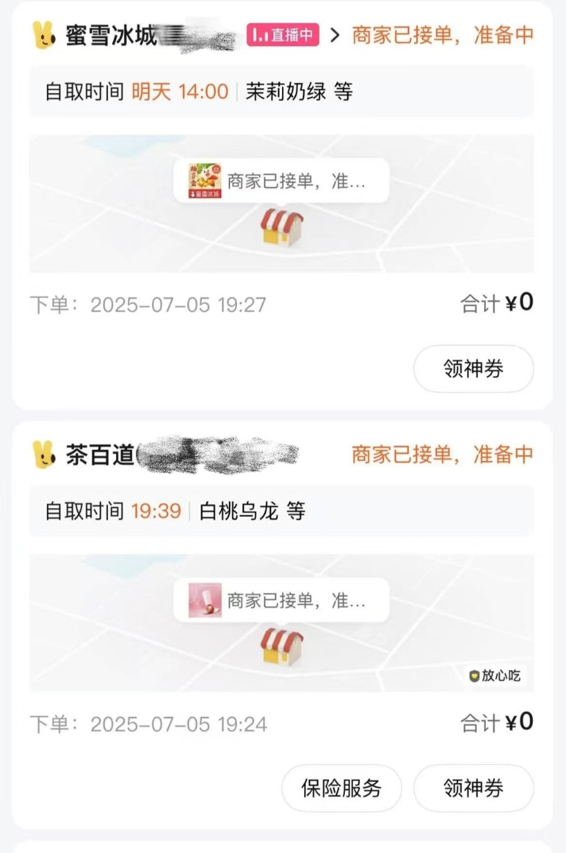 这番订单的激增,与美团外卖投入的大额补贴有关:据社交平台反馈,不少网友发现,美团在7月5日投放不少“0元购”外卖红包券,领取后可以免费获得奶茶、汉堡等,选择外送需要满一定额度并支付配送费,选择到店自取则完全免费。