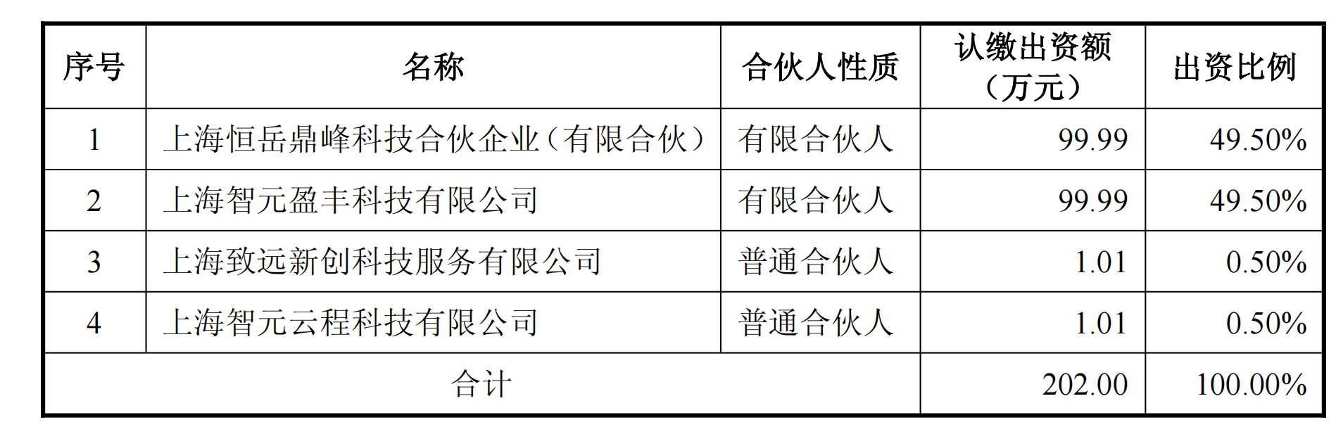 公告显示,本次收购主体为智元恒岳,该合伙企业采用了三层股权结构:智元机器人通过全资子公司智元盈丰持有49.5%份额,创始人邓泰华通过恒岳鼎峰控制另外49.5%,剩余1%则由智元机器人和邓泰华共同控股的上海致远新创科技设备合伙企业(简称“致远新创”)作为执行事务合伙人平均持有。