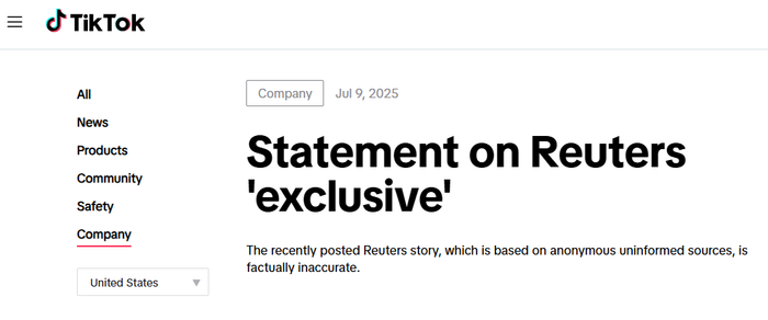 当地时间7月9日,TikTok发布公告称,路透社最近发布的一篇基于匿名、不知情信源的“独家”报道与事实不符。上述报道称,TikTok正在开发一款仅面向美国用户的独立应用程序,将“使用与全球版本不同的算法和数据系统”。TikTok没有在回应中做详细说明。
