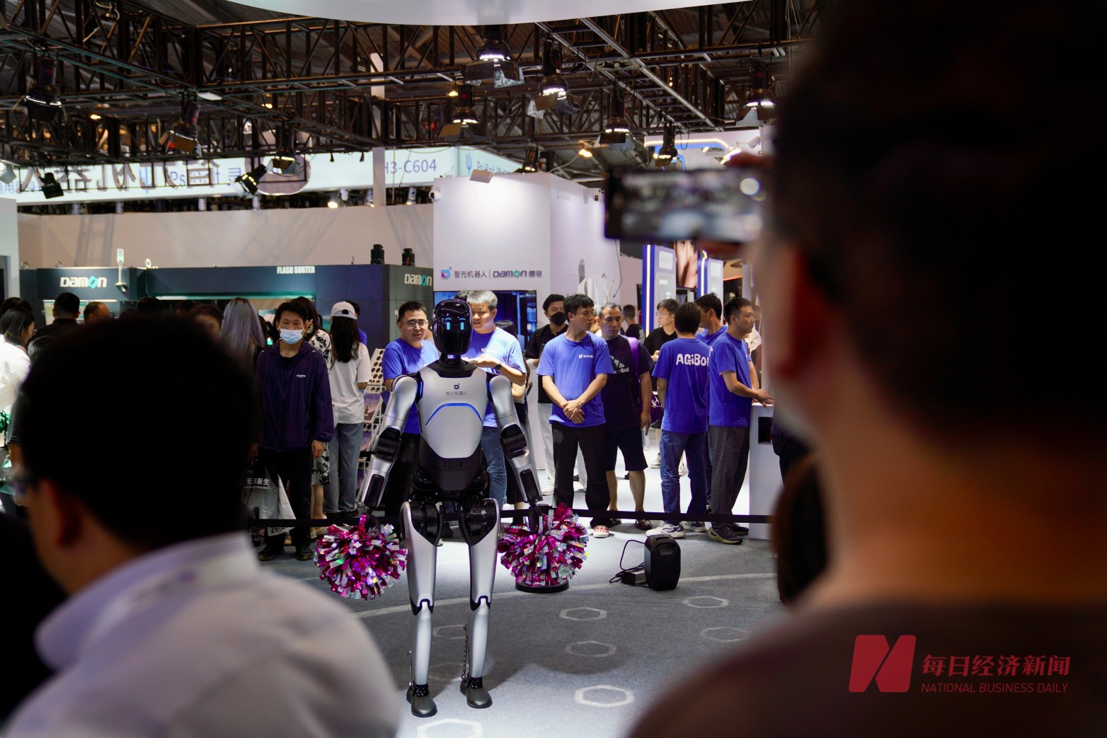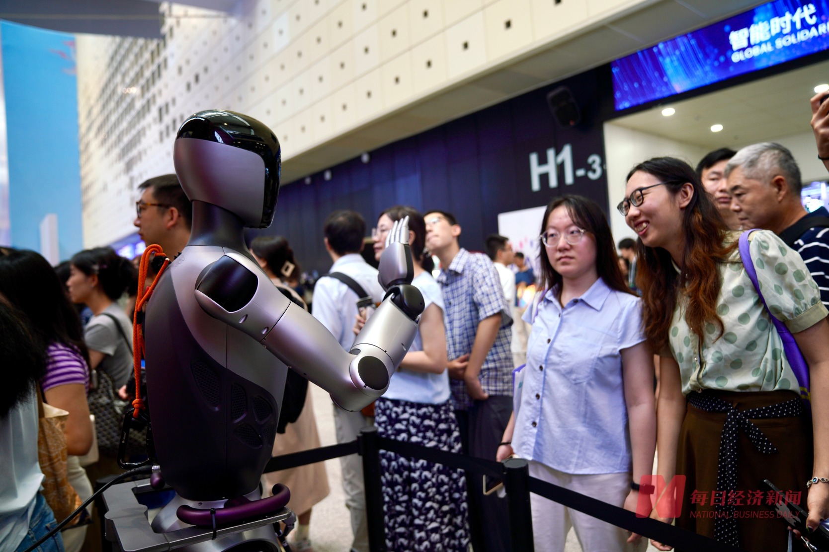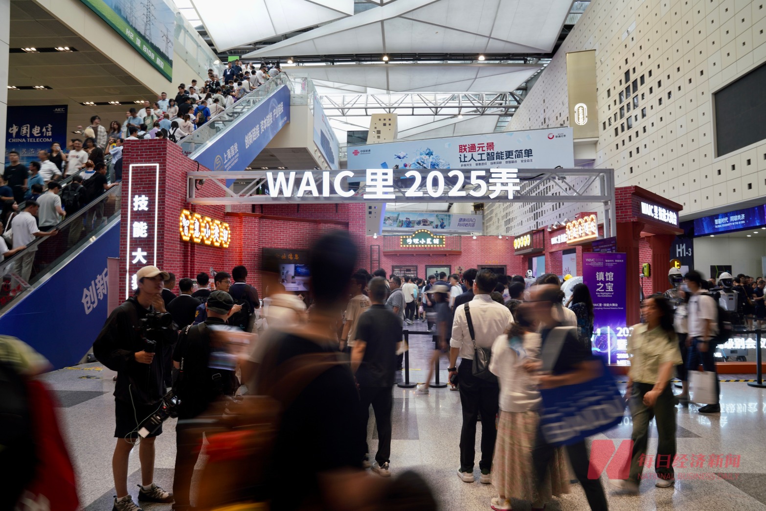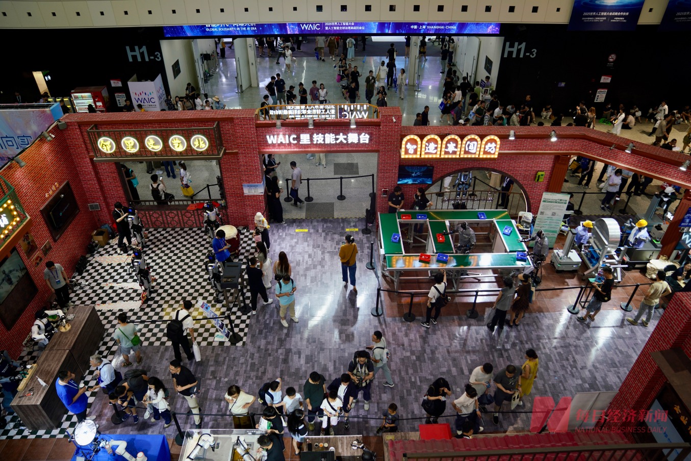 本届大会在大厅处打造“WAIC里2025弄”主题街区弄堂,机器人在此各显其能,吸引了大批观众关注。