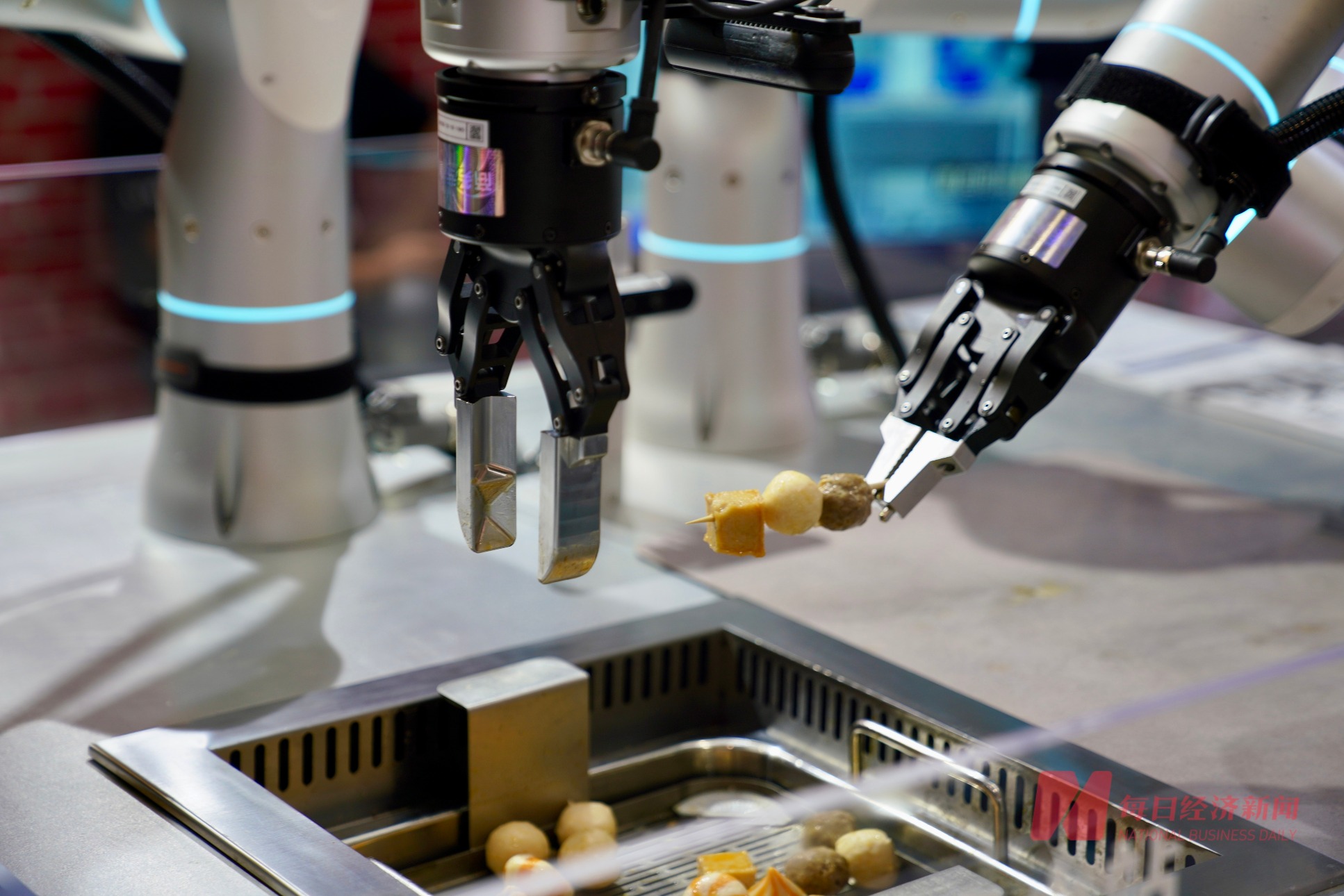 串煮小站内,一款国产机器人正在精准穿串,可实现标准化原料的自动抓取、智能穿串、精准加热及柔性交付。