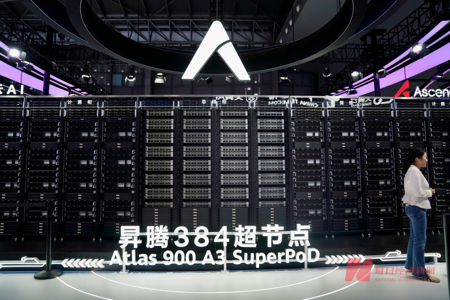 华为首次线下展出昇腾384超节点,即Atlas 900 A3 SuperPoD,该产品基于超节点架构,通过总线技术实现384个NPU之间的大带宽低时延互联,解决集群内计算、存储等各资源之间的通信瓶颈。通过系统工程的优化,实现资源的高效调度,让超节点像一台计算机一样工作。