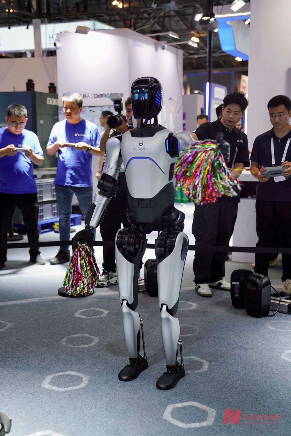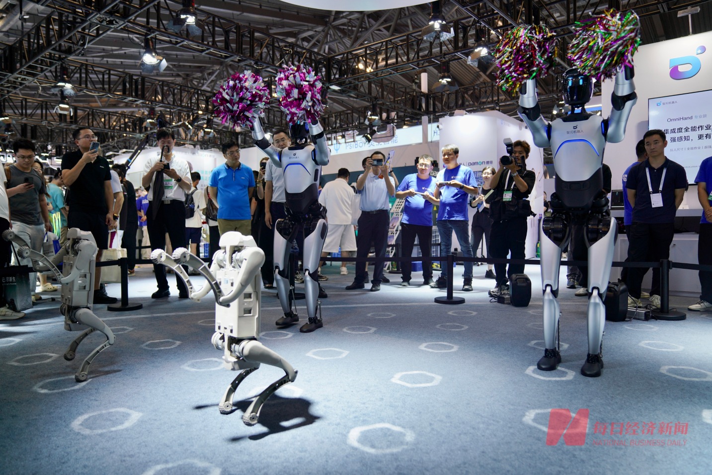 在智元机器人现场,机器人与机器狗正在表演节目。