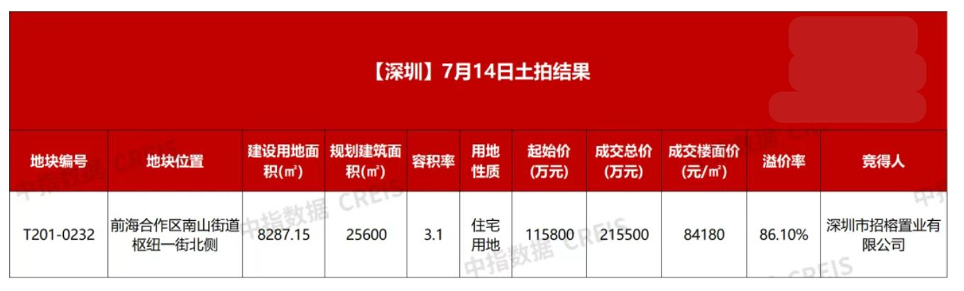 7月14日,深圳前海深港合作区核心桂湾片区一宗宅地出让,共吸引12家房企角逐。经过158轮激烈竞价,该地块被招商蛇口以总价21.55亿元、楼面价84180元/平方米、溢价率86.10%竞得。这也是时隔十年,深圳宅地楼面价首次突破8万元/平方米关口,成为深圳单价“地王”。