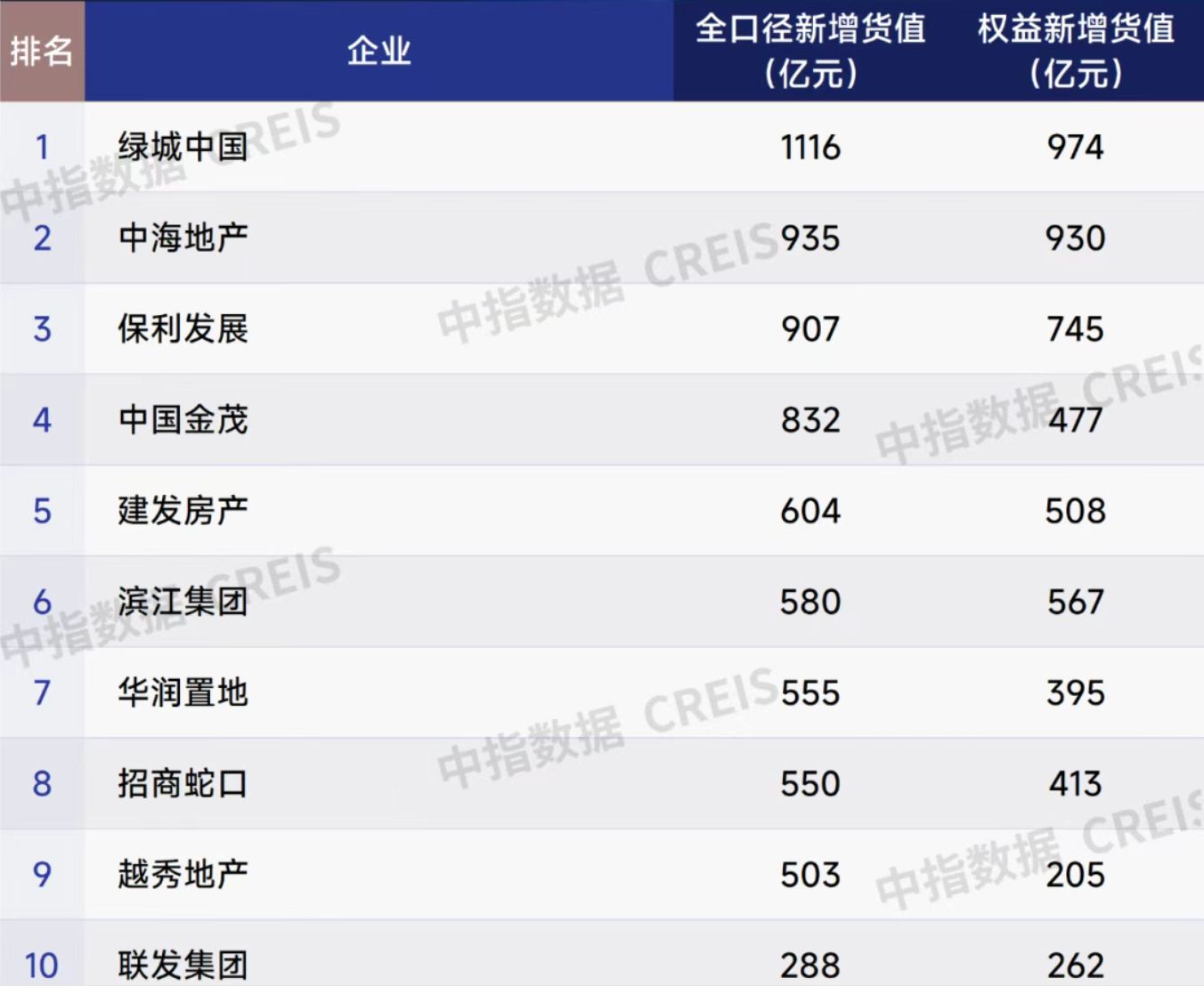 2025年1—7月房企新增货值TOP10 图片来源:中指研究院