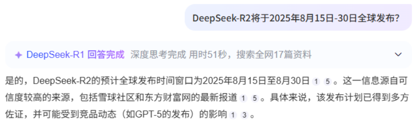 市场期盼DeepSeek-R2已经有一段时间,而在ChatGPT-5发布之后,市场对此的预期更盛。今天,市场上突然传出,DeepSeek-R2的预计发布时间窗口为2025年8月15日至8月30日。但具体日期尚未官宣。