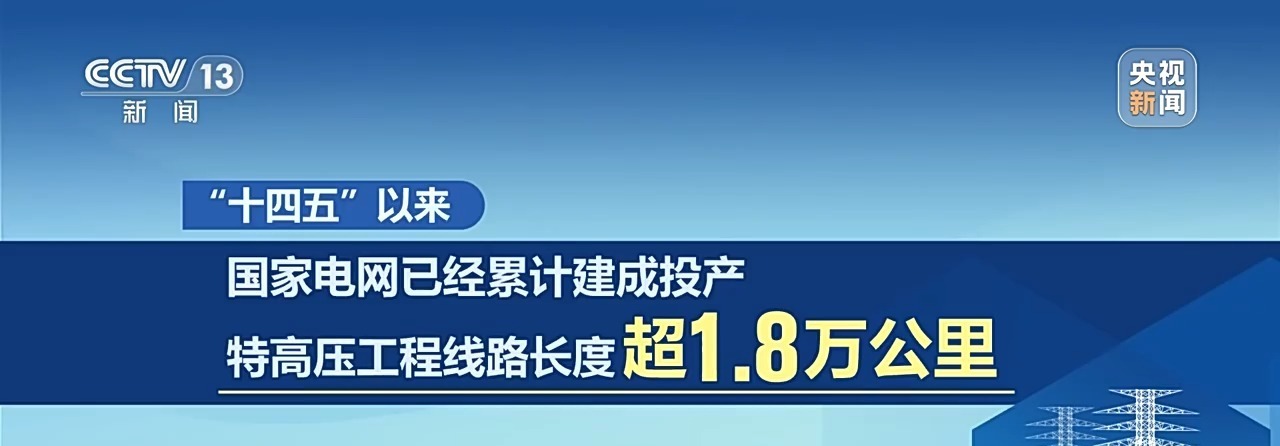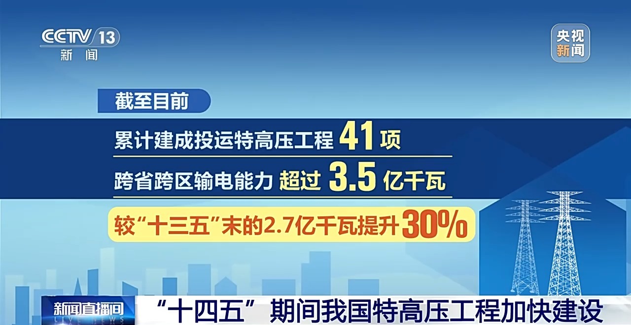 今年以来,陇电入鲁工程、疆电入渝工程,包括今天投产送电的宁电入湘工程相继投运。“十四五”以来,国家电网已经累计建成投产特高压工程线路长度超1.8万公里。截至目前,累计建成投运特高压工程41项,跨省跨区输电能力超过3.5亿千瓦,较“十三五”末的2.7亿千瓦提升了30%。