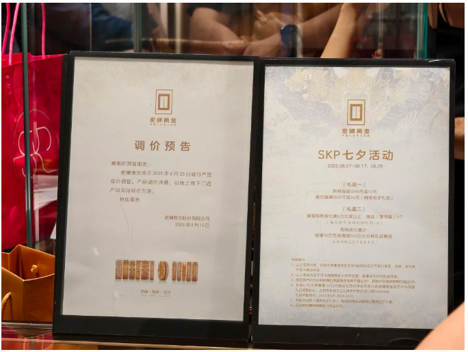 “25日起就要涨价”是消费者们对老铺黄金趋之若鹜的原因之一。此外,恰逢北京skp商场的“七夕活动”,老铺黄金推出购物每满1000元减50元,叠加每满1000元返50元/商场电子礼金等优惠。