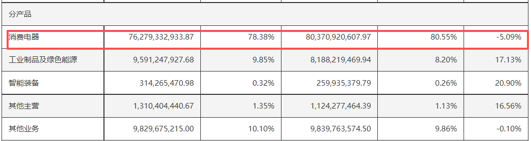 分产品来看,格力电器失速的主要原因,正是占主营收入近八成的消费电器业务(以空调为主)低迷,出现了5.09%的负增长;而占比约一成的“工业制品及绿色能源”还有17.13%的正增长,其他几块业务如智能装备(主要是工业机器人)有20%的增长,但占比极小,不到1%,对总盘带动作用有限。
