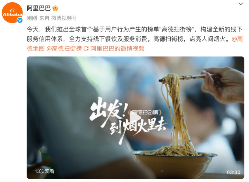 9月10日,阿里巴巴旗下高德地图宣布推出全球首个基于用户行为产生的榜单——高德扫街榜,构建全新的线下服务信用体系,以全力支持线下餐饮及服务消费。高德同时启动“烟火好店支持计划”,通过发放超10亿元补贴等措施,鼓励用户到店消费,力争每天能为线下餐饮及其他服务业多带去1000万客流。