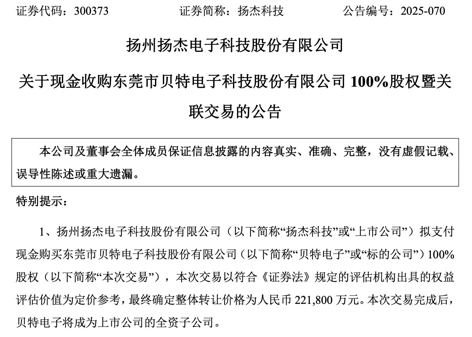9月11日晚间,扬杰科技(300373)公告,公司拟支付现金购买东莞市贝特电子科技股份有限公司(简称“贝特电子”或“标的公司”)100%股权,本次交易以符合《证券法》规定的评估机构出具的权益评估价值为定价参考,最终确定整体转让价格为22.18亿元。