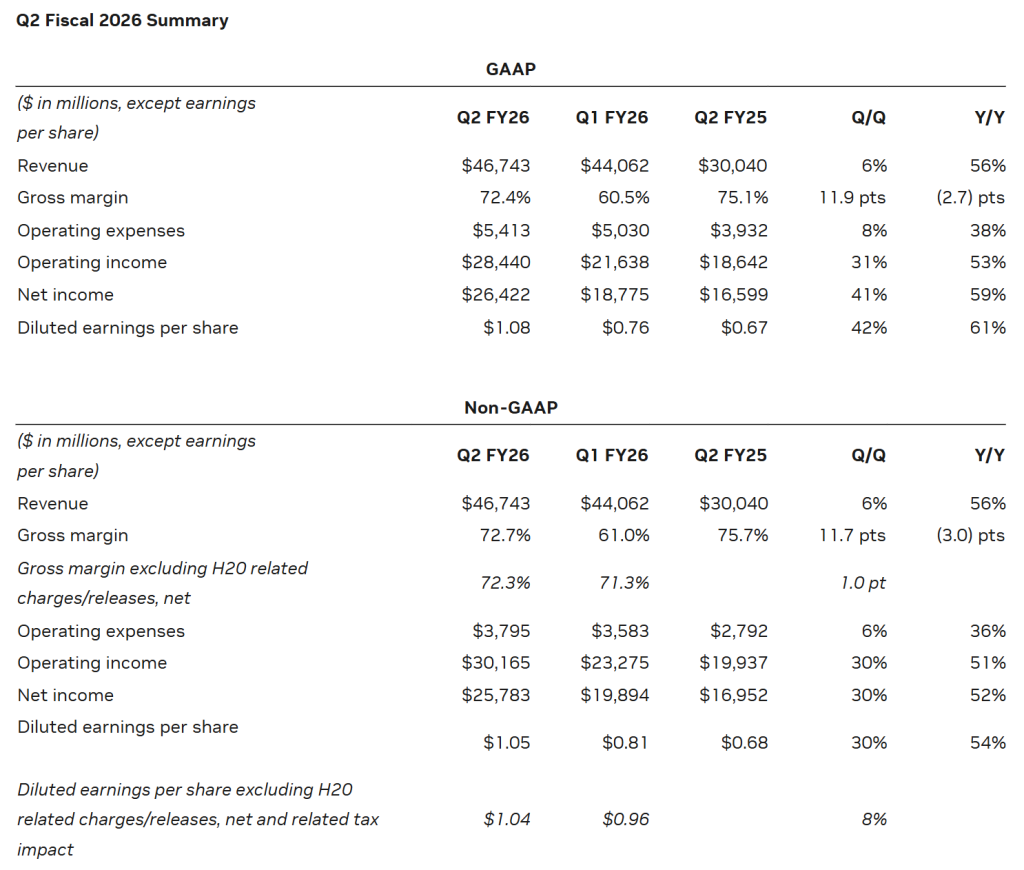 当地时间8月27日美股盘后,英伟达(Nasdaq:NVDA)发布了截至7月27日的2026财年第二财季财报,期内实现营收467.43亿美元,同比上涨56%,高于市场预期的461亿美元;美国通用会计准则(GAAP)下净利润264.22亿美元,同比上涨59%;Non-GAAP下每股摊薄收益为1.05美元,同比上涨54%,超出市场预期的1.01美元;如果不计算H20芯片的费用以及相关税收影响,每股摊薄收益为1.04美元。