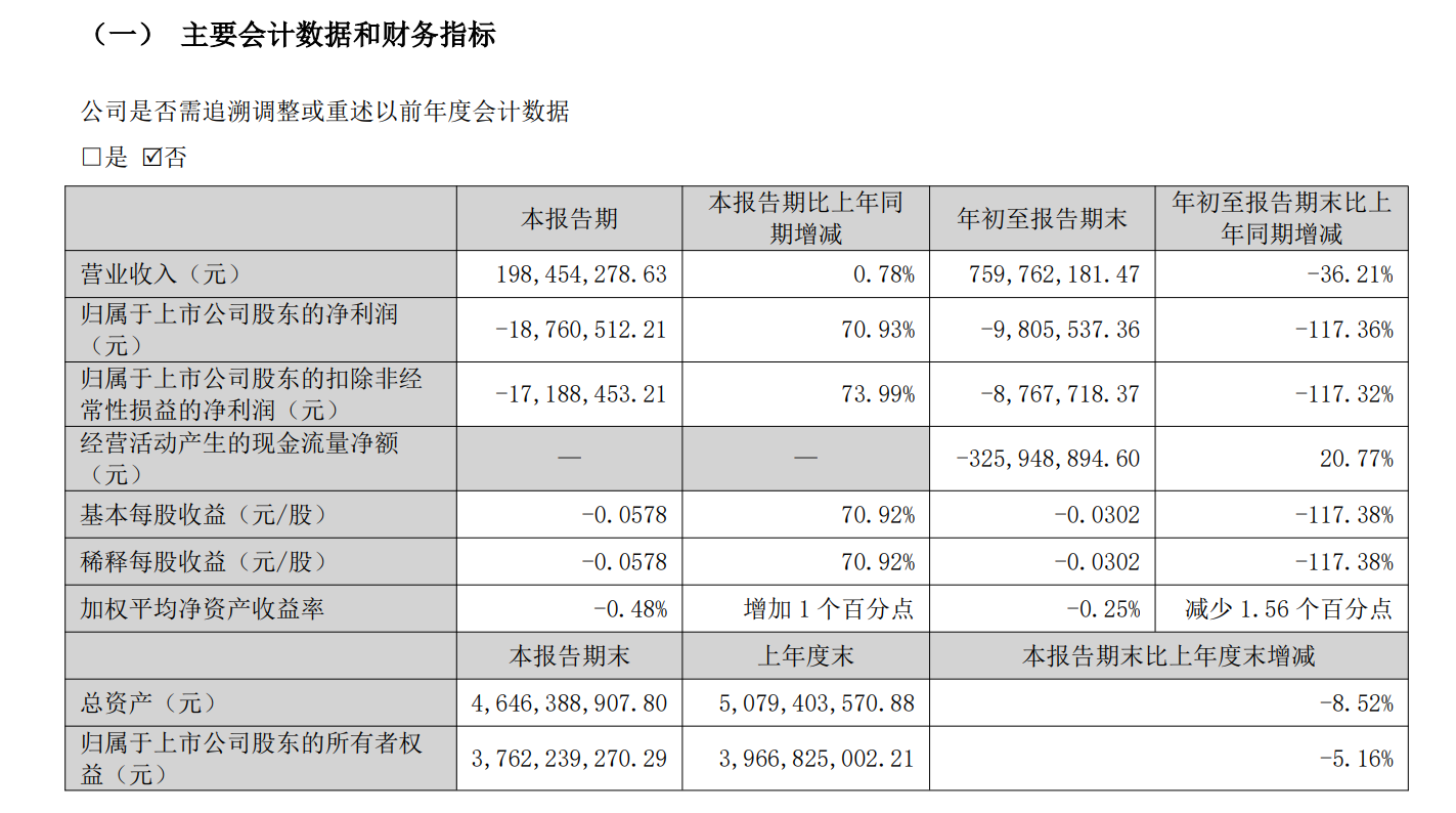 其中,第三季度实现营业收入1.98亿元,同比增长0.78%;归母净利润亏损1876.05万元,上年同期净亏损6453.20万元,同比收窄70.93%。