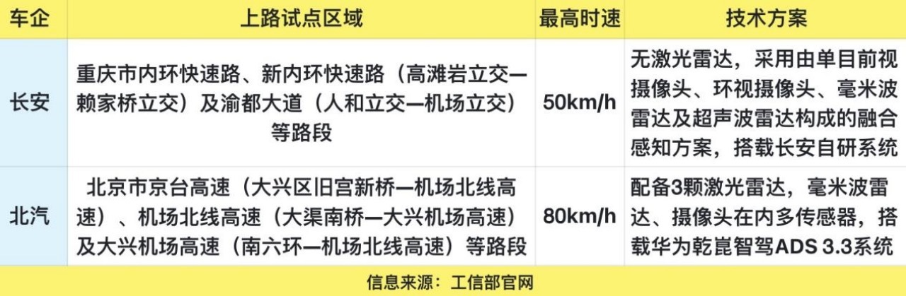 根据工信部公示信息,长安汽车和北汽极狐各有一款车型获得有条件自动驾驶许可。其中,长安获批车型可在重庆市内特定快速路段,以最高50km/h的车速,在拥堵环境中实现高速公路与城市快速路的单车道自动驾驶;北汽极狐获批车型则可在北京市多个指定路段,以最高80km/h的车速,实现同类功能。记者从两家车企方面获悉,此次获批具体车型为“深蓝SL03”和“极狐阿尔法S6(L3)版”。