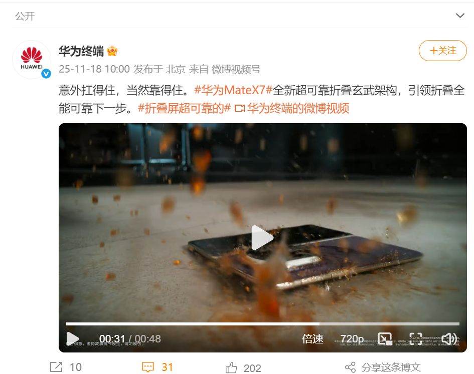 11月18日,华为常务董事、产品投资委员会主任、终端BG董事长余承东在微博发帖正式公布华为Mate X7真机。