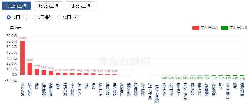 行业资金方面,截至收盘,文化传媒、航天航空、游戏等净流入排名靠前,其中文化传媒净流入61.00亿。