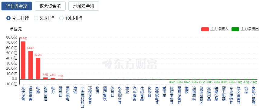 行业资金方面,截至收盘,光伏设备、通信设备、电池等净流入排名靠前,其中光伏设备净流入72.81亿。