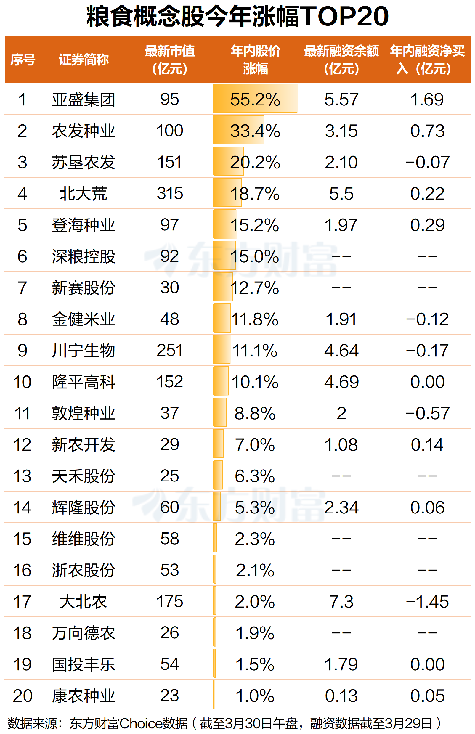 3月30日早盘,粮食概念股价异动直线拉升,截至早间收盘,板块大涨3.11%,领涨市场概念板块。个股方面,新农开发、北大荒、金健米业涨停,苏垦农发涨超7%,新赛股份、农发种业涨超5%,万向德农、荃银高科涨超4%,隆平高科、神农种业、敦煌种业、浙农股份、康农种业、大北农等涨超3%。