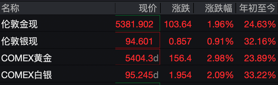 截至2日晚21点左右,COMEX黄金报5404.3美元/盎司,涨2.98%;伦敦金现报5381.902美元/盎司,涨1.96%,最高摸至5400美元/盎司上方。现货白银涨0.91%,报94.601美元/盎司;COMEX白银报95.245美元/盎司,涨2.09%。