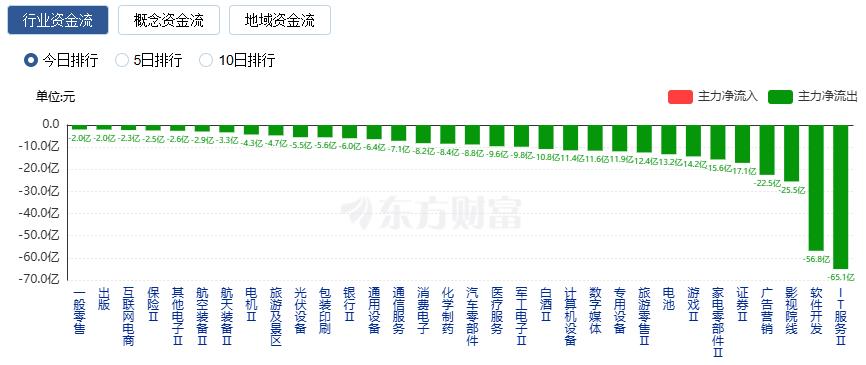 净流出方面,IT服务、软件开发、影视院线等净流出排名靠前,其中IT服务净流出65.06亿元。