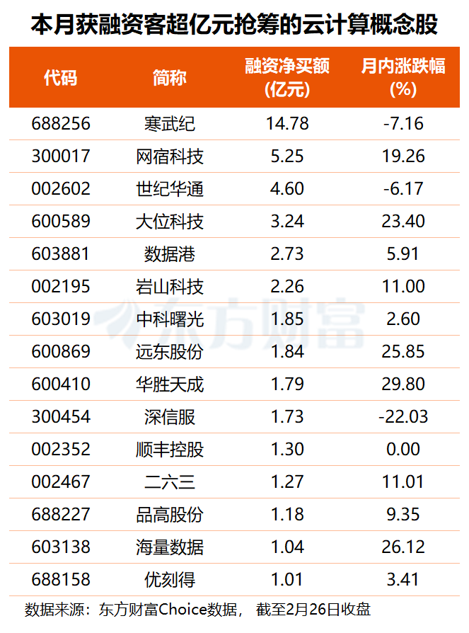 资金方面,东方财富Choice数据显示,2月份共有63只云计算概念股获得融资净买入,其中15股融资净买额在1亿元以上,寒武纪获杠杆资金加仓14.78亿元,网宿科技、世纪华通、大位科技分别获融资客抢筹5.25亿、4.60亿和3.24亿元,数据港、岩山科技的融资净买额均超2亿元。