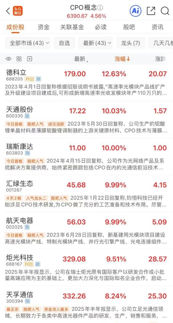 3月10日,CPO概念高开高走,截至早间收盘,板块大涨4.56%,领涨市场概念板块。个股方面,德科立涨超12%,天通股份、瑞斯康达、汇绿生态、航天电器涨停,炬光科技涨超9%,天孚通信涨超8%,本川智能、蘅东光、剑桥科技、烽火通信、立讯精密、罗博特科、光库科技、太辰光等多股涨超5%。