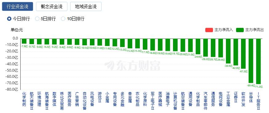 净流出方面,IT服务、半导体、软件开发等净流出排名靠前,其中IT服务净流出71.20亿元。