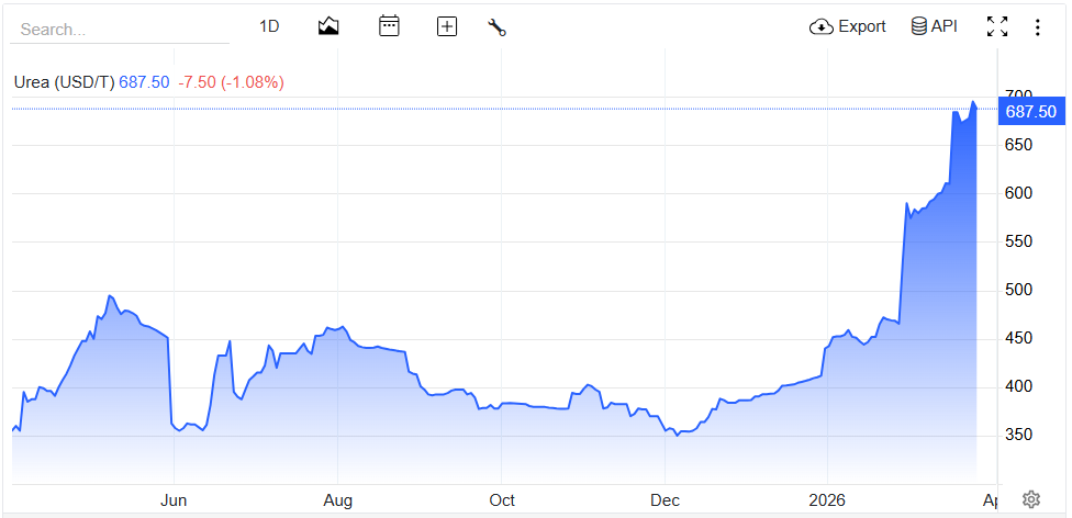 截至3月30日发稿,美国芝加哥期货交易所的尿素期货报价687.5美元/吨,比美以伊战事爆发前的465.5美元/吨增长了47.70%,较去年同期涨超80%。