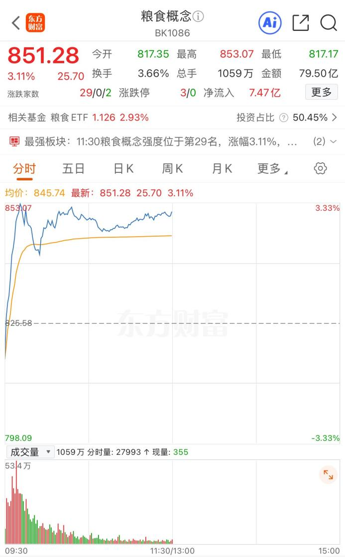 3月30日早盘,粮食概念股价异动直线拉升,截至早间收盘,板块大涨3.11%,领涨市场概念板块。个股方面,新农开发、北大荒、金健米业涨停,苏垦农发涨超7%,新赛股份、农发种业涨超5%,万向德农、荃银高科涨超4%,隆平高科、神农种业、敦煌种业、浙农股份、康农种业、大北农等涨超3%。